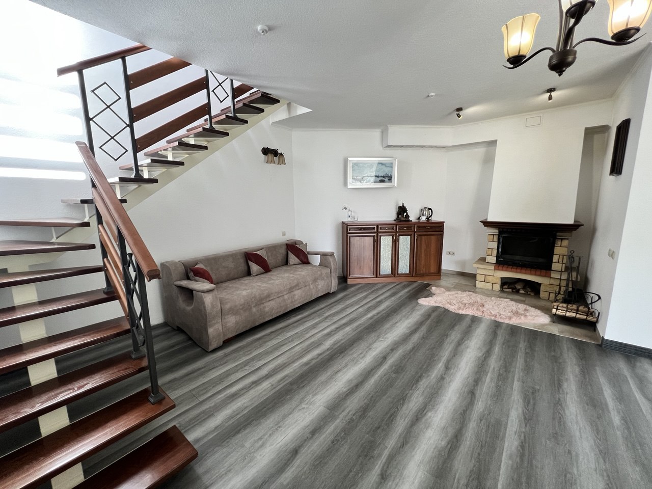 Пропонуємо готельний номер загальною площею 90,4 кв.м на четвертому поверсі з виглядом на гори та річку Прут. На першому рівні - велика вітальня з каміном та відкритою теорасою, на другому рівні - спальня, просторий санвузол з ванною.