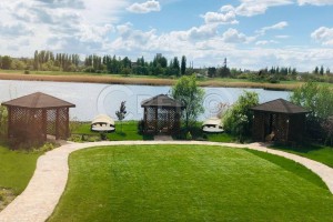 Велика зона відпочинку з бесідками та садовими шезлонгами.