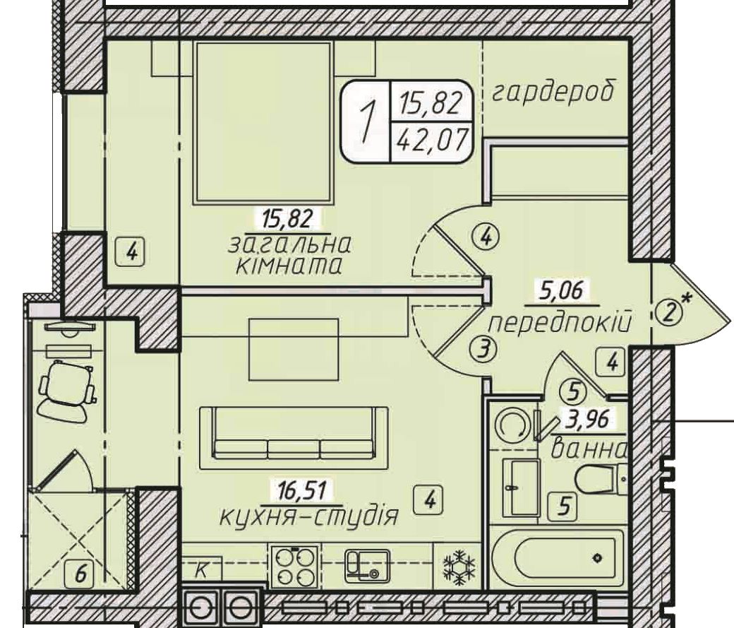 1 кімн., площа 42/15/17, поверх 6/6