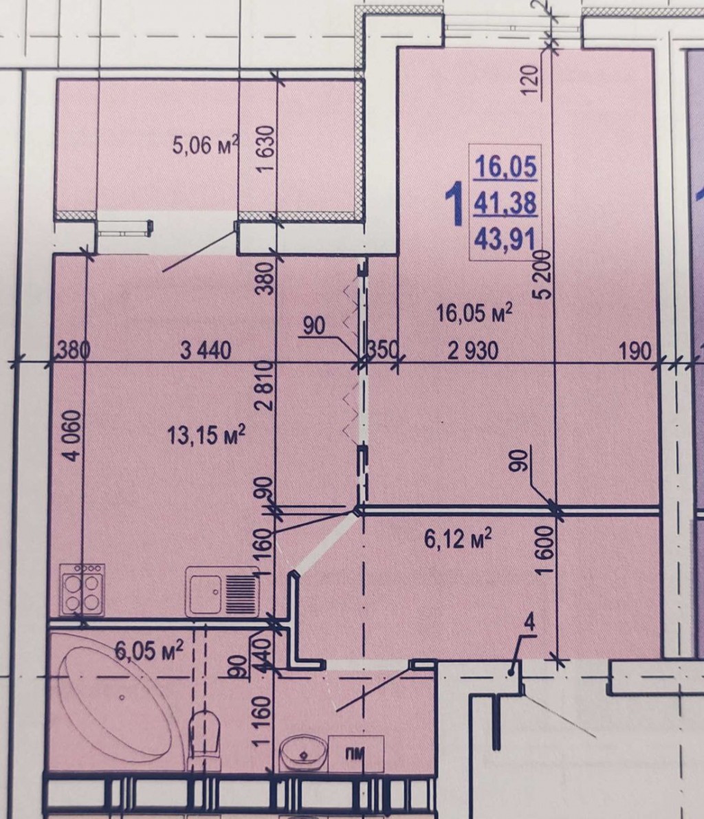 1 кімн., площа 40/16/10, поверх 6/9