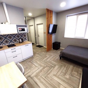 Загальна площа - 96,7 кв.м: перший поверх - дві ізольовані смарт-квартири, кожна з кухнею та санвузолм, по 22 кв.м, з євроремонтом та теплою підлогою. Повністю укомплектовані мебліми (дивани, ліжка, вбудовані кухонні меблі, столи, стільці) та побутовою технікою (тв плазми, холодильники, мікрохвильові пічі, варочні плити, пральні машини, кондиціонери, бойлери). другий поверх - 50 кв.м з окремим входом з вулиці, свої сходини. Квартира без меблів, зроблені всі виводи під комунікації, обладнаний санвузол.
