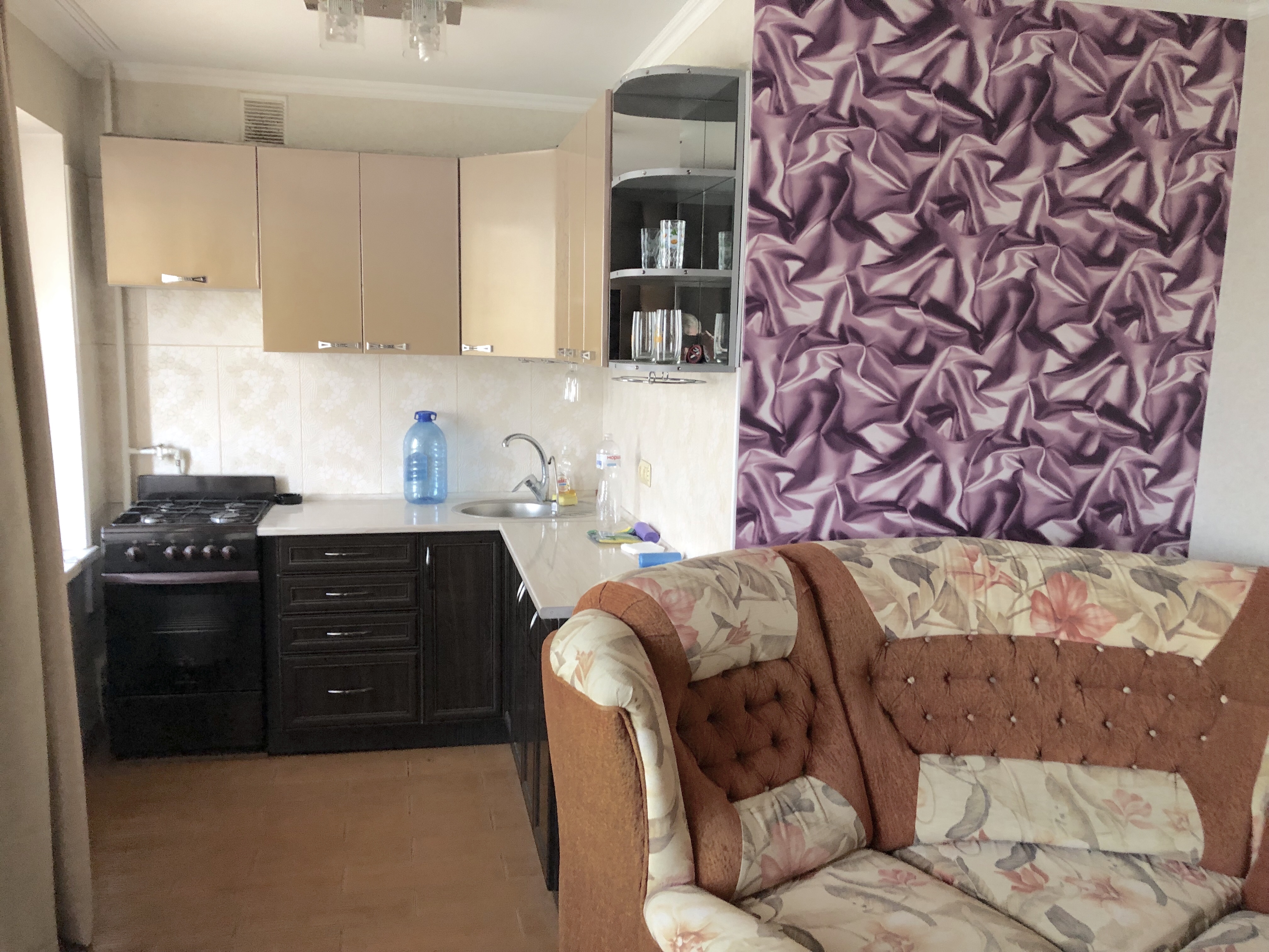 Кухня студия - большой угловой диван, холодильник. Современный телевизор, работает от флэшки, вай Фай.